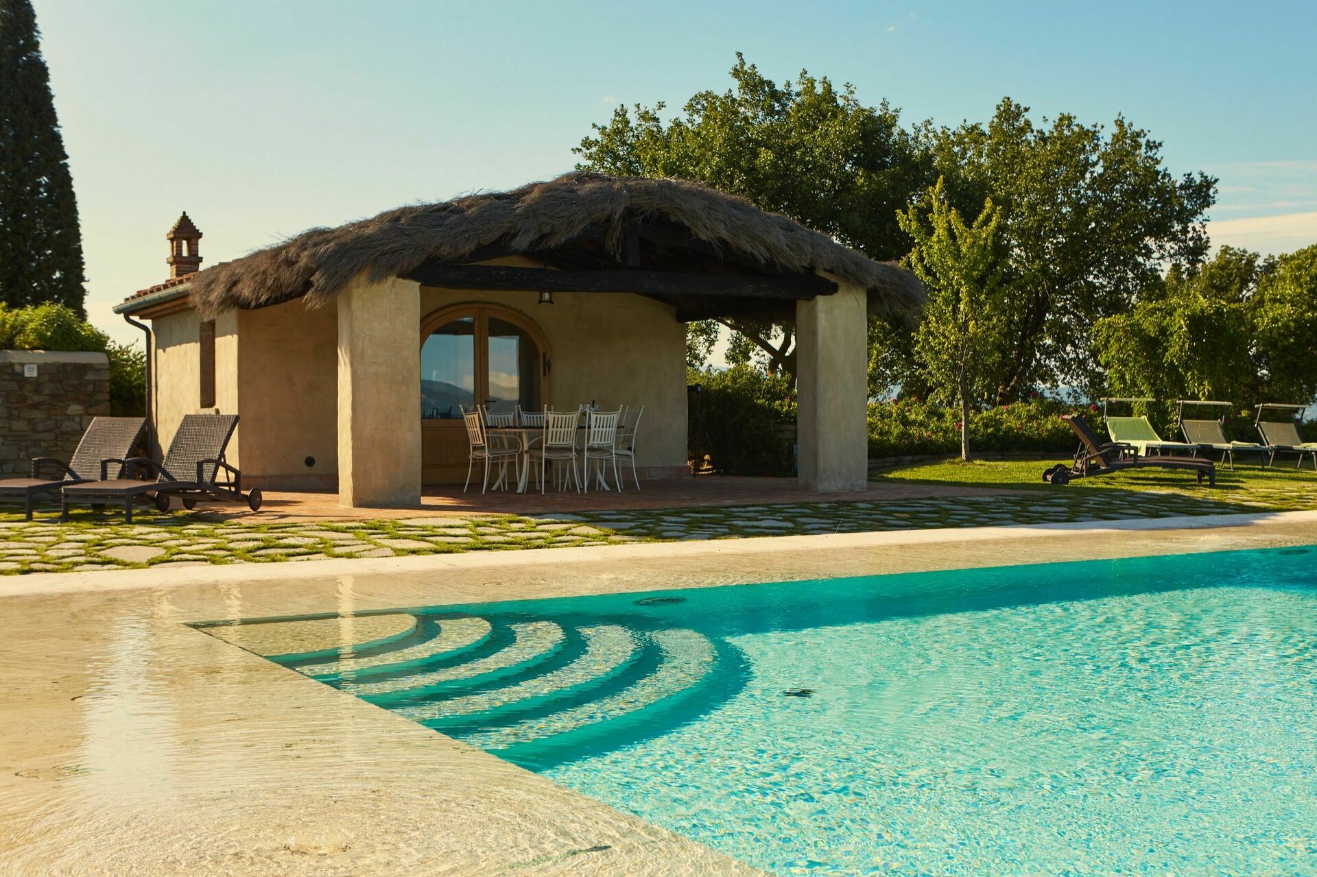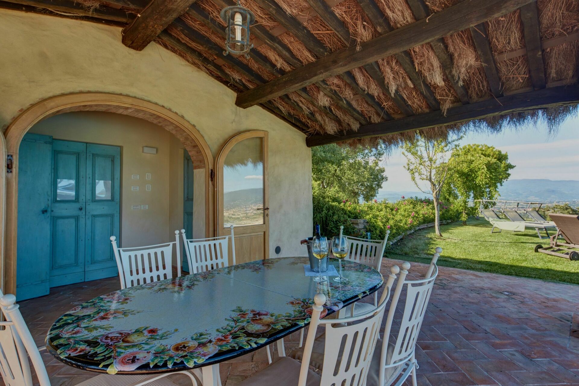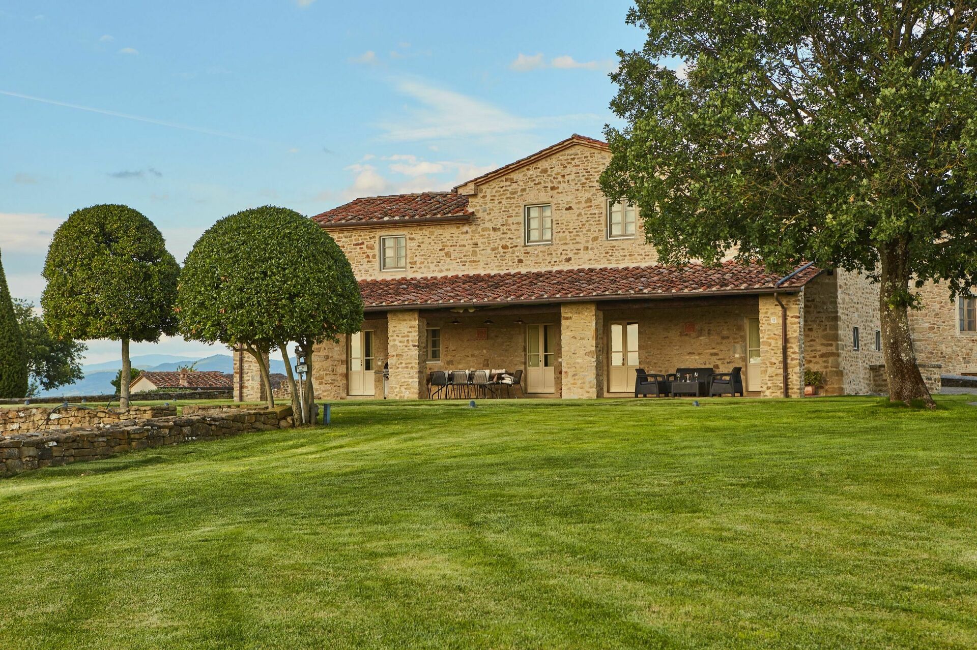 Bella villa ricavata dall’attenta ristrutturazione di un nucleo di case situate sulla sommità di una collina che domina tutta la Valdichiana e la città di Arezzo. All’interno della proprietà (completamente recintata) è presente (oltre alla villa in affitto) la casa dei proprietari e una bellissima chiesetta risalente al VII secolo. Il giardino che circonda la casa è molto curato e ampio ed offre una splendida e panoramica piscina è riservata all’uso esclusivo degli ospiti. La villa è stata suddivisa in 4 appartamenti ma tramite l’apertura di porte interne viene affittata come un’unica abitazione. Gli interni sono confortevoli e arredati con gusto. Al pian terreno gli ospiti possono disporre di un ampio porticato attrezzato ideale per mangiare all’aperto.